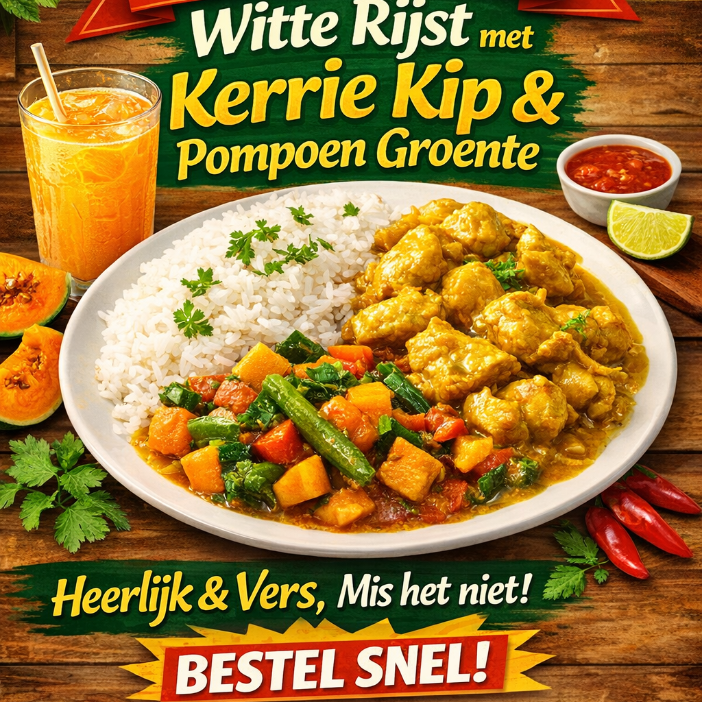 Ontdek de smaak van Suriname! Kom genieten van onze heerlijke Surinaamse nasi. Onze witte rijst wordt geserveerd met overheerlijkekerrie kip.